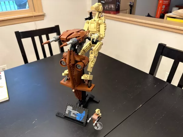 Собрав с сыном несколько фигурок LEGO, таких как Железный Человек-паук и Новый Капитан Америка, я считаю, что этот боевой дроид превосходит их по качеству исполнения. Хотя конечности пропорционально толще, чем в фильмах, разница незначительна, если не сравнивать их напрямую. Такие детали, как шестерни на коленях и тонкие стержни, соединяющие предплечья с локтями, являются отличными штрихами. В целом это визуально впечатляющая модель.